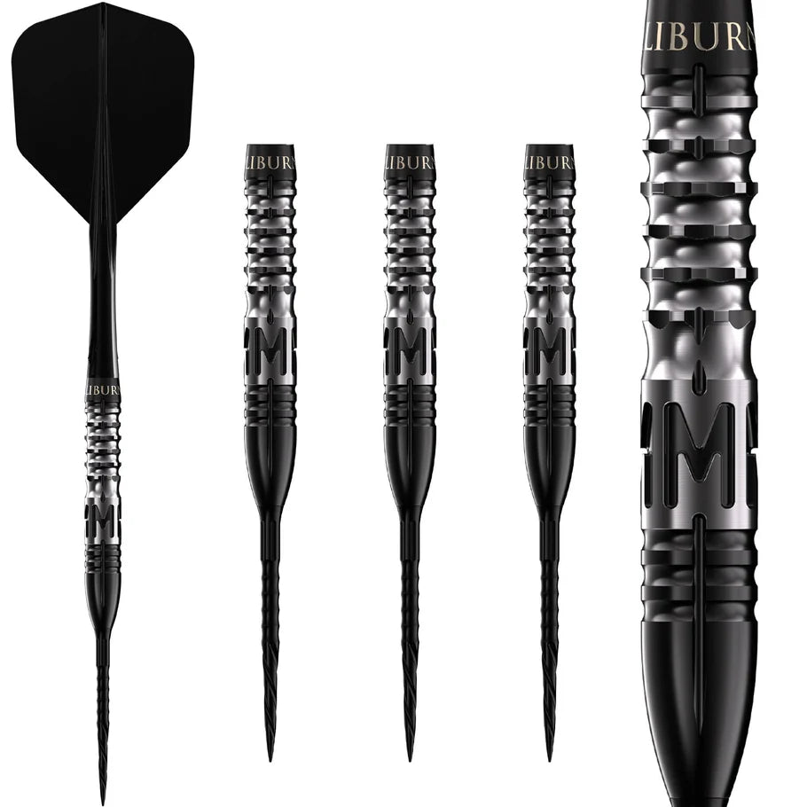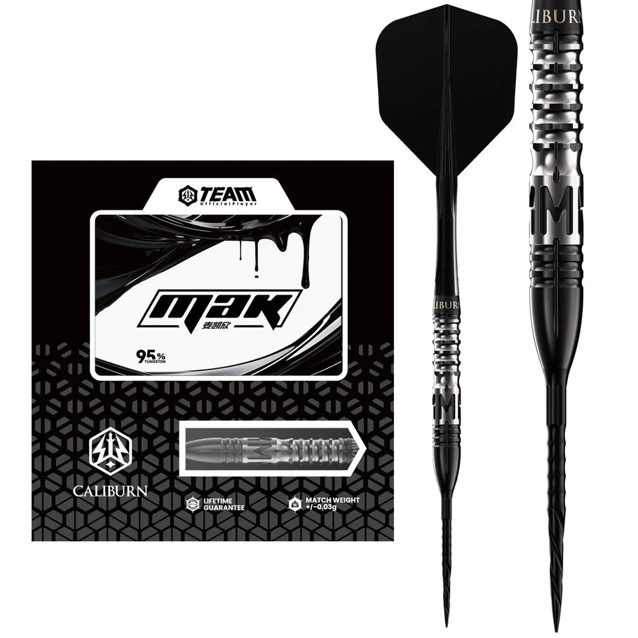 Caliburn Player Darts - Steel Tip - 95% Tungsten - Mak. Expertly designed for ultimate precision, Caliburn Player Darts offer a high-quality playing experience. Made of 95% tungsten, these steel-tip darts feature black-coated barrels with a ringed grip and milling, allowing for improved accuracy and control. Dominate the competition with the best darts on the market. Supplied fitted with the Caliburn Replaceable Point System.