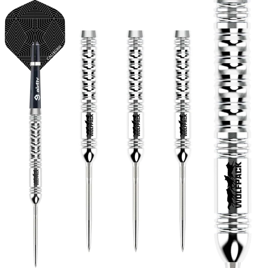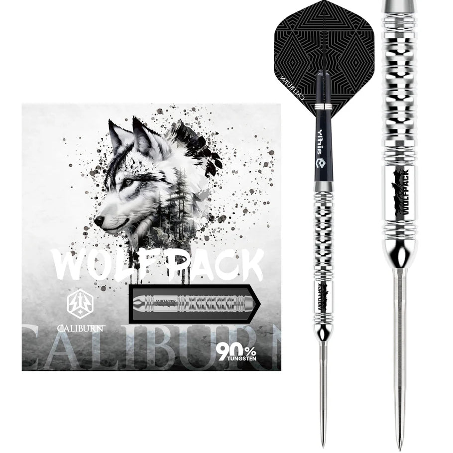 Caliburn Wolfpack Darts - Steel Tip - 90% Tungsten - W1 - 23g. Master the game of darts with the Caliburn Wolfpack Darts. These steel tip darts feature a 90% tungsten composition for superior balance and control. The straight barrel design and ringed grip ensure optimal precision with every throw. Elevate your darts game with the Caliburn Wolfpack. Supplied fitted with the Caliburn Replaceable Point System.