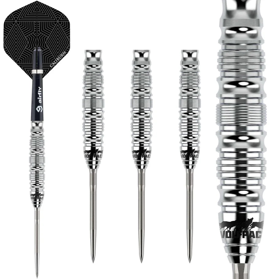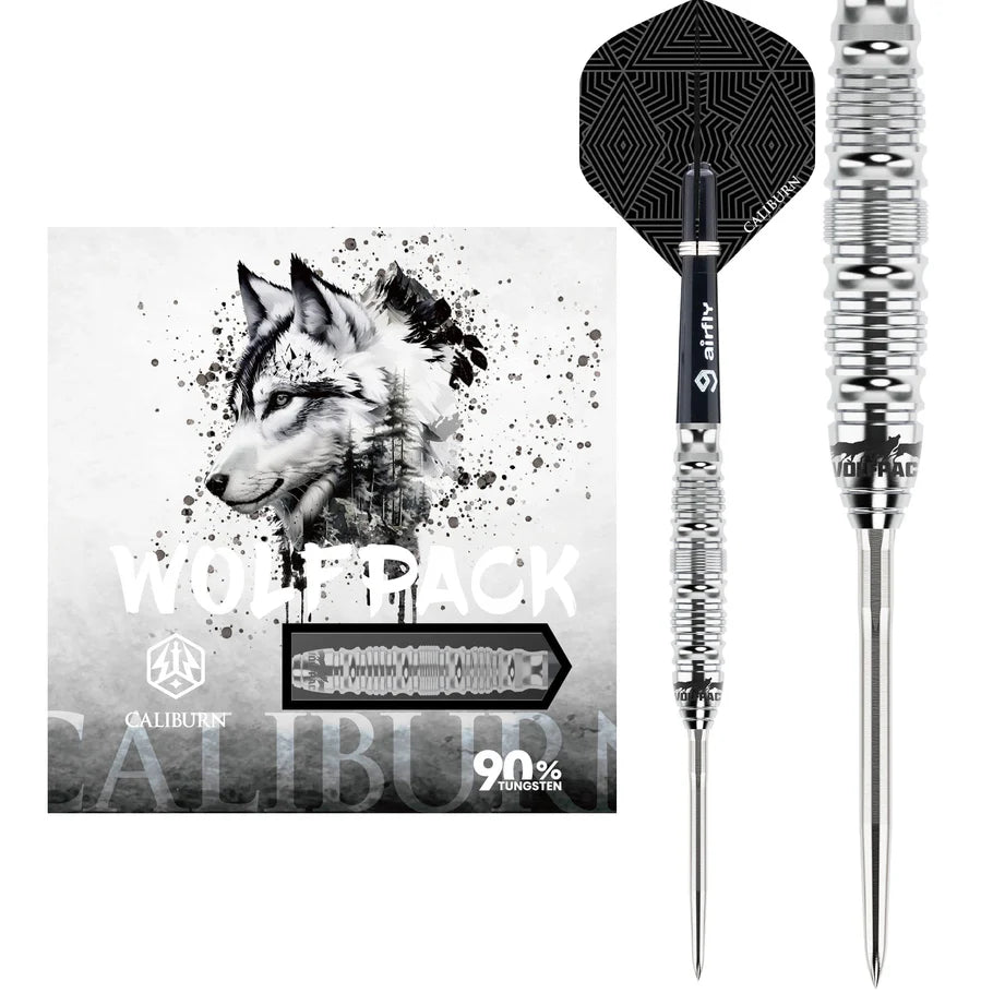 Caliburn Wolfpack Darts - Steel Tip - 90% Tungsten - W5 - 22g. Expertly crafted for serious dart players, the Caliburn Wolfpack Darts provide precision and control with a 90% tungsten barrel and micro ring grip. Perfect for competitive play, these steel tip darts come in a 22g weight for optimal accuracy. Elevate your game with Caliburn Wolfpack Darts. Supplied fitted with the Caliburn Replaceable Point System.