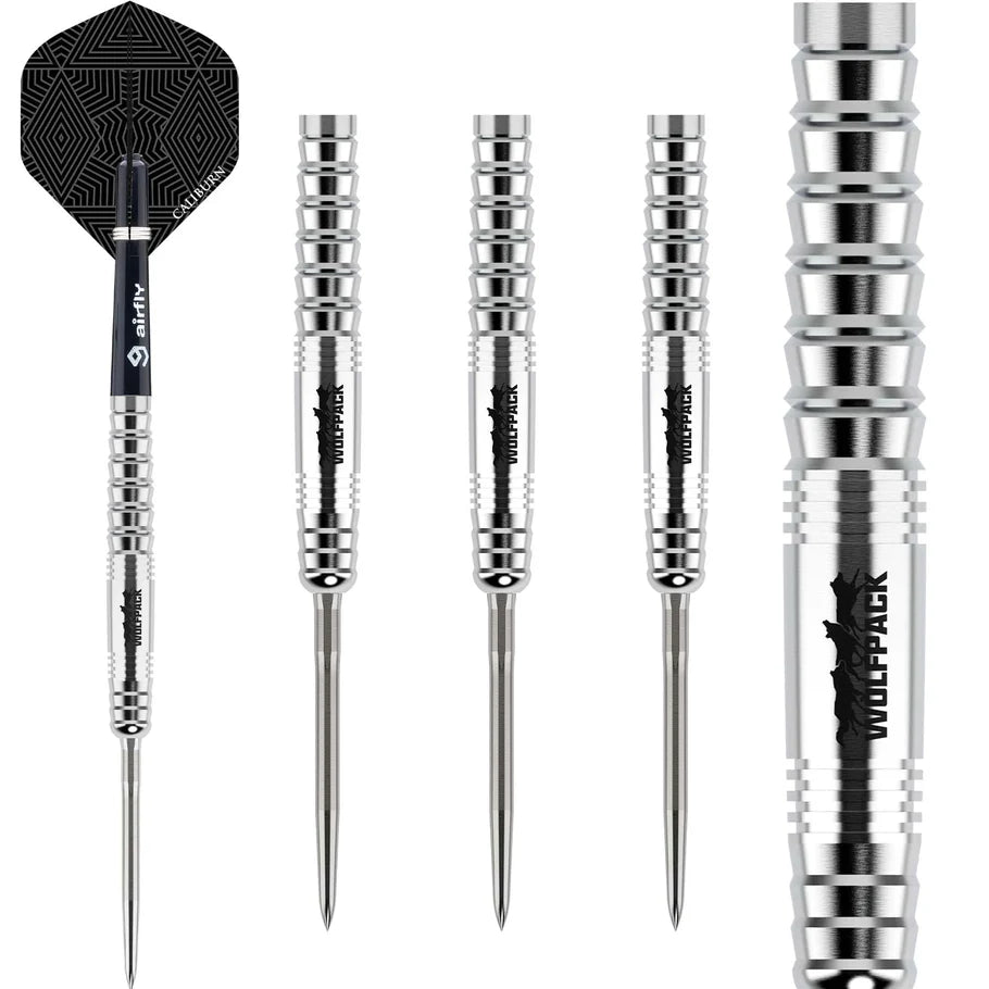 Caliburn Wolfpack Darts - Steel Tip - 90% Tungsten - W6 - 22g. Crafted by Caliburn, the Wolfpack darts boast 90% straight tungsten barrels for precise and powerful throws. With a razor grip, these steel tip darts give you the confidence and control you need to dominate the game. Choose the W6 model in 22g for unbeatable accuracy. Supplied fitted with the Caliburn Replaceable Point System.
